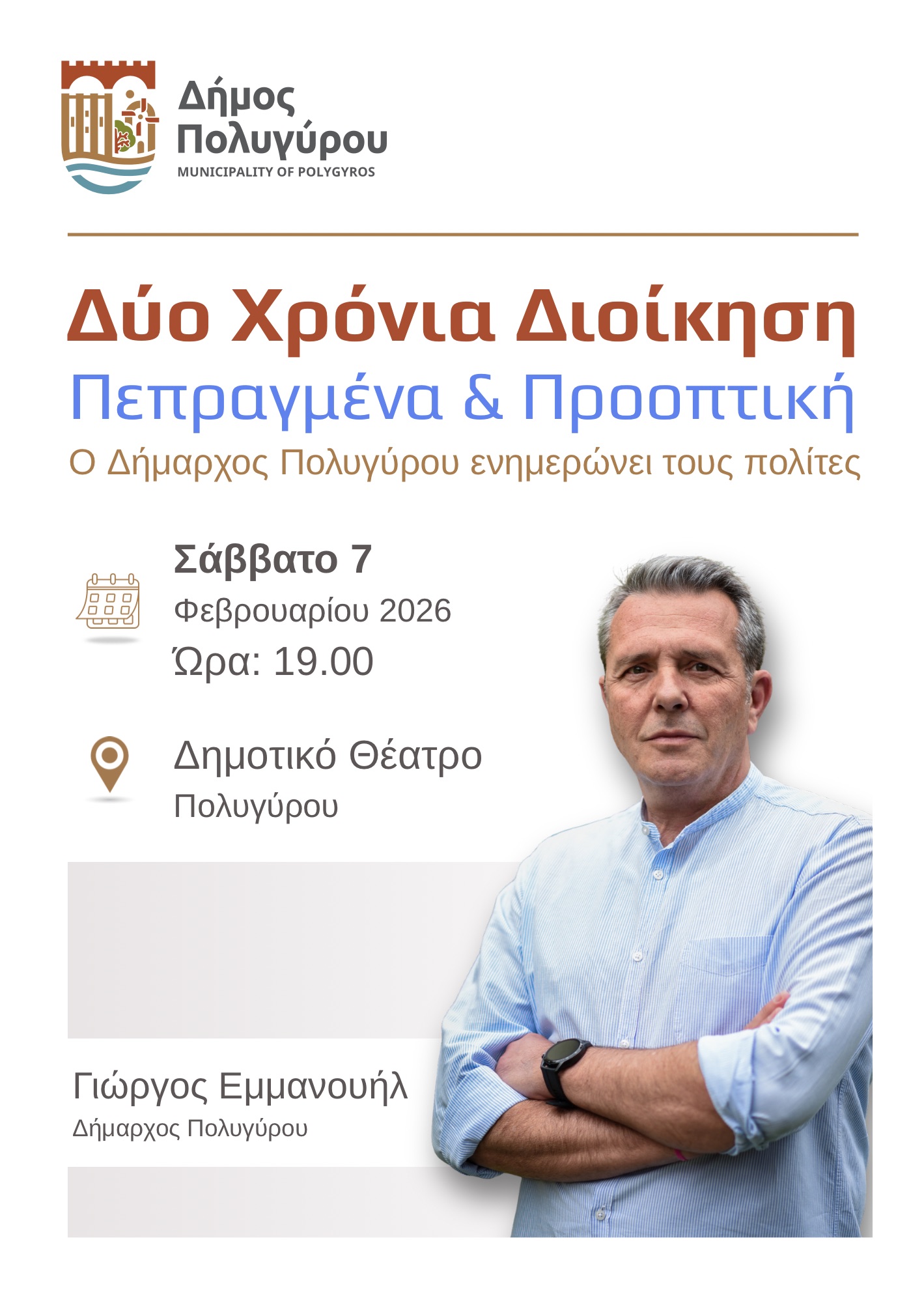 Για τον λόγο αυτό και με γνώμονα την ασφάλεια των πολιτών, αναβάλλεται η προγραμματισμένη για αύριο εκδήλωση ενημέρωσης των πολιτών, η οποία μετατίθεται για το Σάββατο 7 Φεβρουαρίου 2026 και ώρα 19:00, στο Δημοτικό Θέατρο Πολυγύρου.