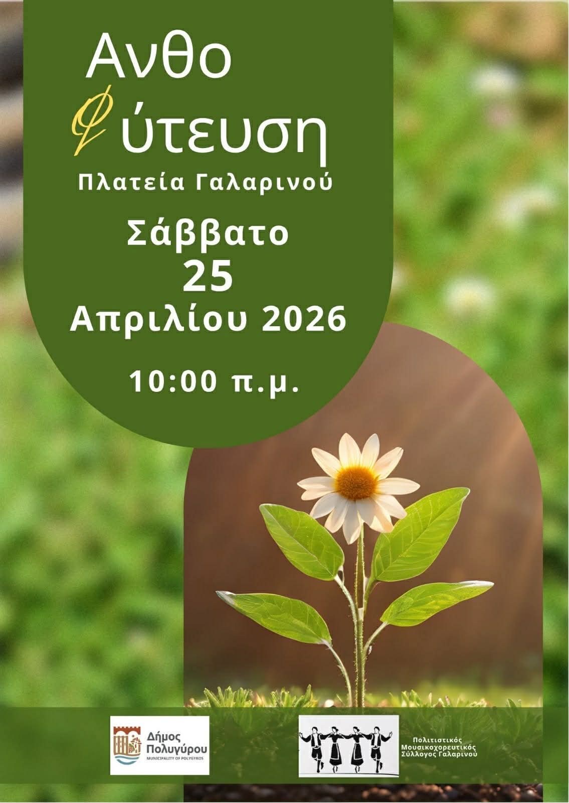 Ο Δήμος Πολυγύρου, σε συνεργασία με τον Πολιτιστικό Μουσικοχορευτικό Σύλλογο Γαλαρινού, διοργανώνει δράση ανθοφύτευσης το Σάββατο 25 Απριλίου και ώρα 10:00 π.μ. στην πλατεία Γαλαρινού.