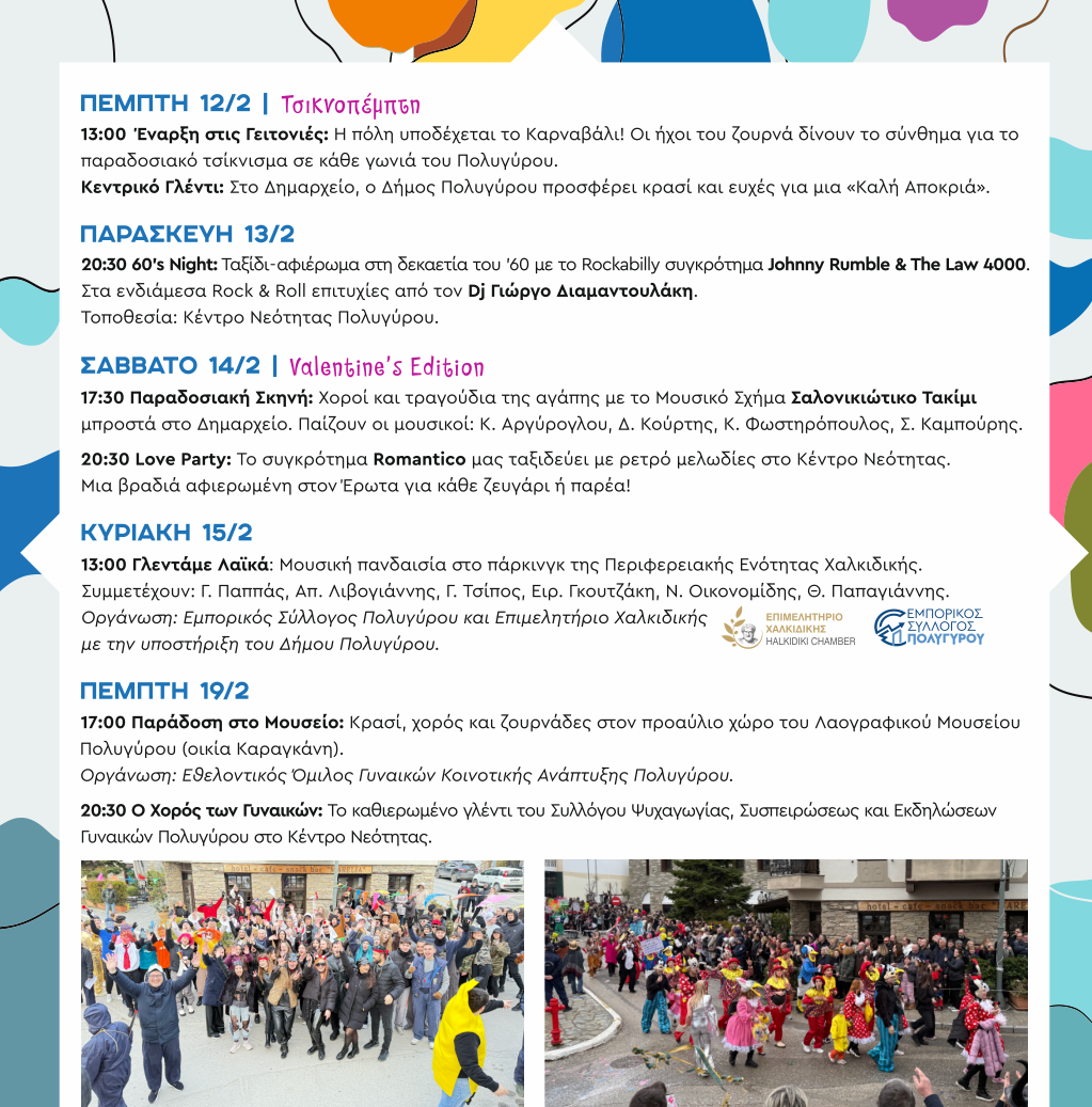 • Κεντρικό Γλέντι: Στο Δημαρχείο, ο Δήμος Πολυγύρου προσφέρει κρασί και ευχές για μια «Καλή Αποκριά».