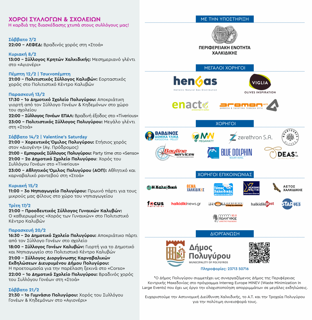 • 17:30 – 1ο Δημοτικό Σχολείο Πολυγύρου: Αποκριάτικη γιορτή από τον Σύλλογο Γονέων & Κηδεμόνων στο χώρο του σχολείου.