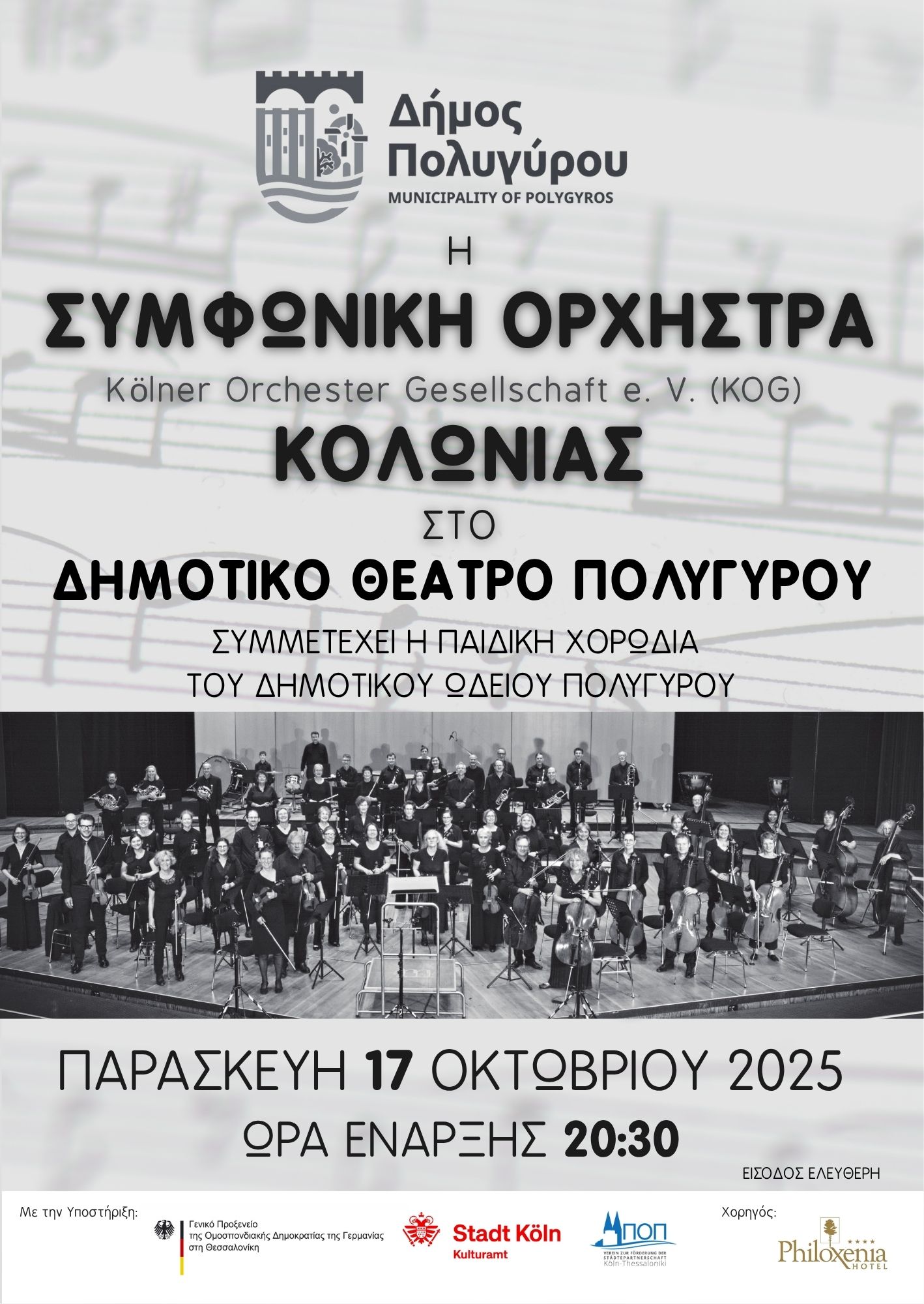 Ο Δήμος Πολυγύρου έχει τη χαρά να φιλοξενήσει τη Συμφωνική Ορχήστρα Kölner Orchester Gesellschaft από την Κολωνία, στο Δημοτικό Θέατρο Πολυγύρου, την Παρασκευή 17 Οκτωβρίου 2025 και ώρα 20:30.