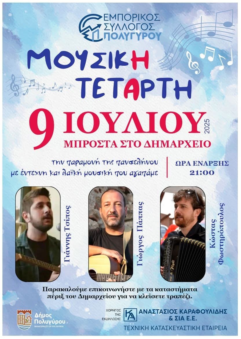 Συνεχίζονται οι εκδηλώσεις στον Δήμο Πολυγύρου και αυτή την εβδομάδα, 7 με 13 Ιουλίου 2025.