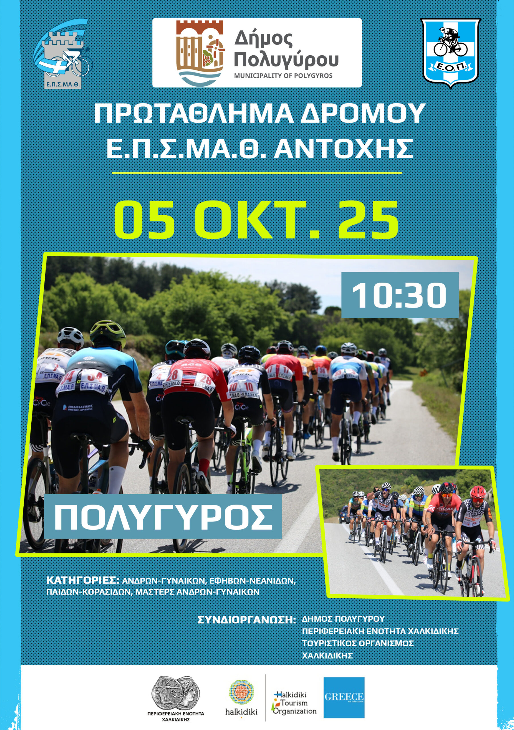 Η Ένωση Ποδηλατικών Σωματείων Μακεδονίας – Θράκης, στο πλαίσιο του Πρωταθλήματος Δρόμου Μακεδονίας-Θράκης, διοργανώνει την Κυριακή 5 Οκτωβρίου 2025, αγώνα Ποδηλασίας Δρόμου Αντοχής, σε συνεργασία με τον Δήμο Πολυγύρου, την Περιφερειακή Ενότητα Χαλκιδικής και τον Τουριστικό Οργανισμό Χαλκιδικής.
