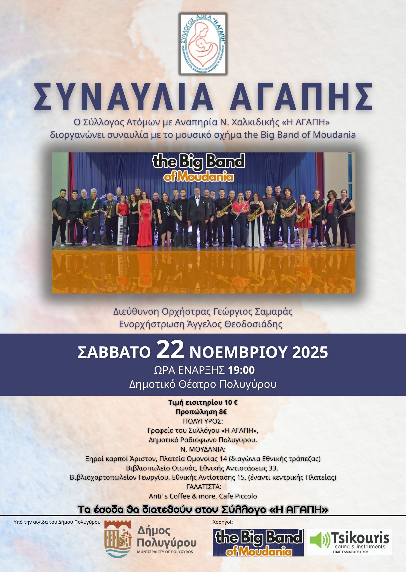 Ο Σύλλογος Ατόμων με Αναπηρία Ν. Χαλκιδικής « Η ΑΓΑΠΗ », διοργανώνει ΣΥΝΑΥΛΙΑ ΑΓΑΠΗΣ με το μουσικό σχήμα the Big Band of Moudania, το Σάββατο 22
