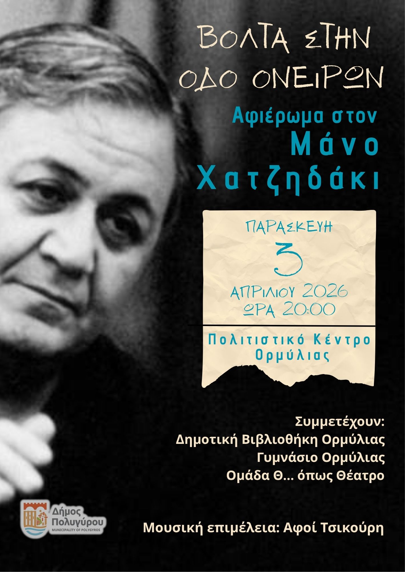 • στο Πολιτιστικό Κέντρο Ορμύλιας, την Παρασκευή 3 Απριλίου 2026 και ώρα 20.00’